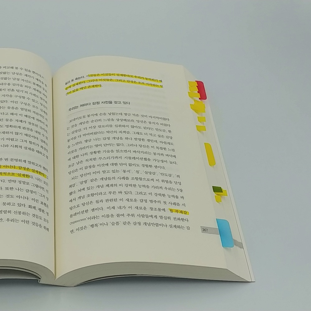 : 인덱스탭은 얇고 휘어지는 소재라 책을 손상시키지 않아요. 메탈 소재로 된 책갈피들은 잘못 사용하면 책장이 찢어지기도 하죠. - 색상별로 다른 의미를 부여할 수 있다.
