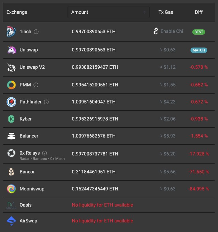 위 사이트 설명과 같이 1인치는 여러 개의 DEX 서비스를 모아서 최고의 가격으로 교환을 할 수 있게 해줍니다. 여러 개의 DEX에 거래를 분할하여 최고의 교환비율을 취할 수 있다고 하네요. (대신에 스마트 컨트랙트를 할 때 수수료가 쎈 것 같아요. 다른 곳과 비교해 본건 아니라 확실하지는 않습니다 ^^;)