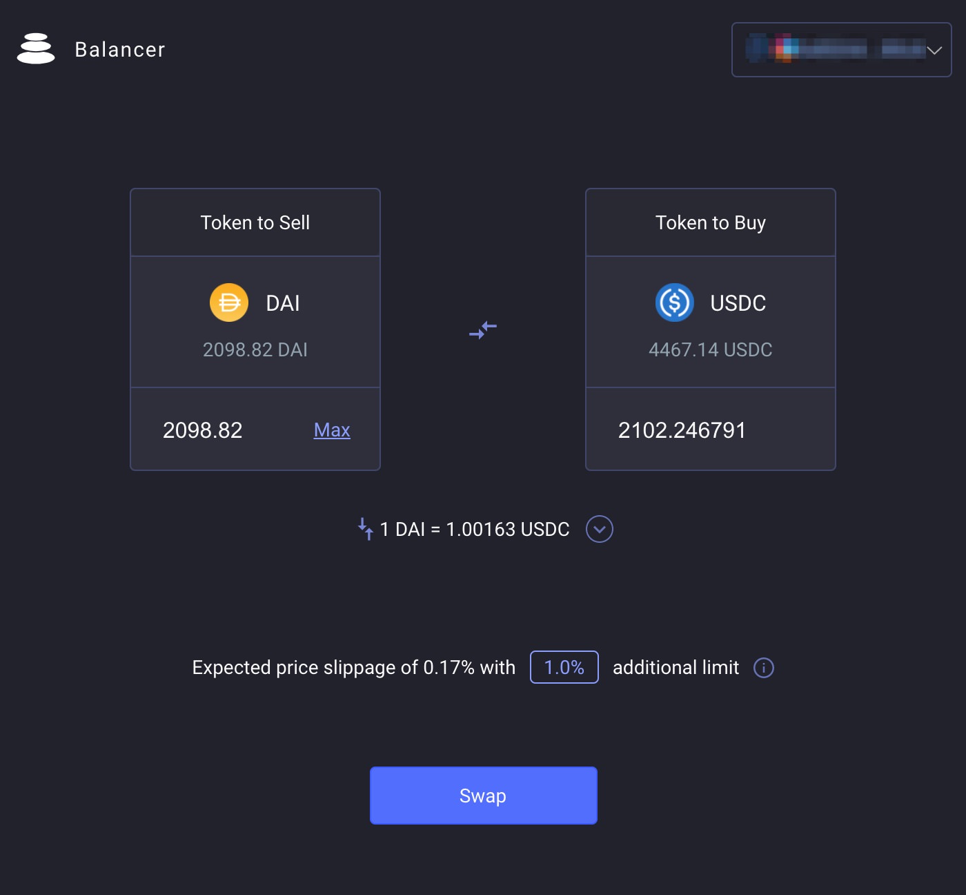 디파이 서비스에 예치(supply)를 할 때 스테이블 코인 간 교환이 필요할 때가 자주 있는데요. 밸런서에서 제공하는 스왑 서비스를 쓰면 간편하게 교환할 수가 있습니다. 위 화면에서 처럼 DAI → USDC로 간편하게 교환할 수 있어요. 밸런서 풀에 예치를 하고 수익으로 받은 BAL 코인을 다른 코인으로 바꿀 때에도 유용합니다.