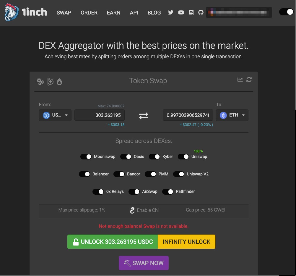 1인치는 특정 스왑 서비스에서 유동성(liquidity)가 부족하여 교환이 힘들 때 쓰면 좋은 것 같아요. 1인치는 여러 스왑 서비스를 모두 교환 풀로 해서 교환할 수 있으니까요.
