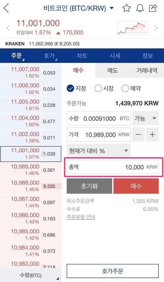 업비트의 경우 매수할 때 총액을 지정해서 사는 것이 가능해요.