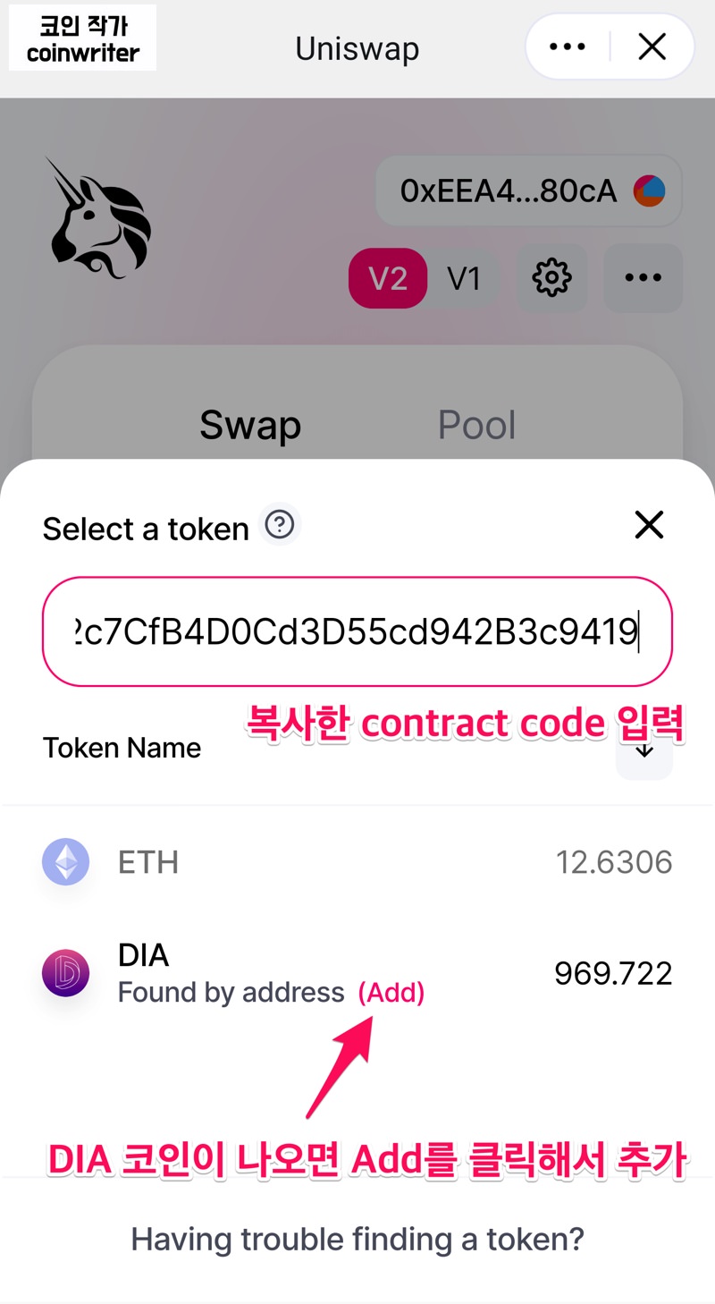 다시 유니스왑으로 와서 복사한 DIA 코인의 contract code 입력