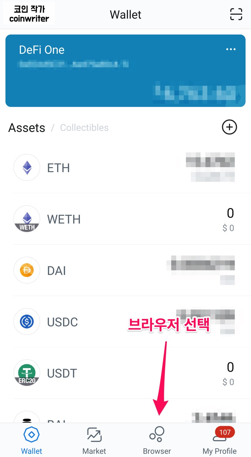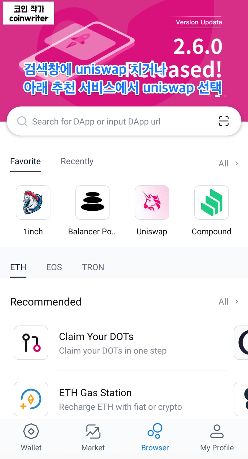 ImToken앱에서 Browser 메뉴를 눌러 유니스왑으로 갑니다.