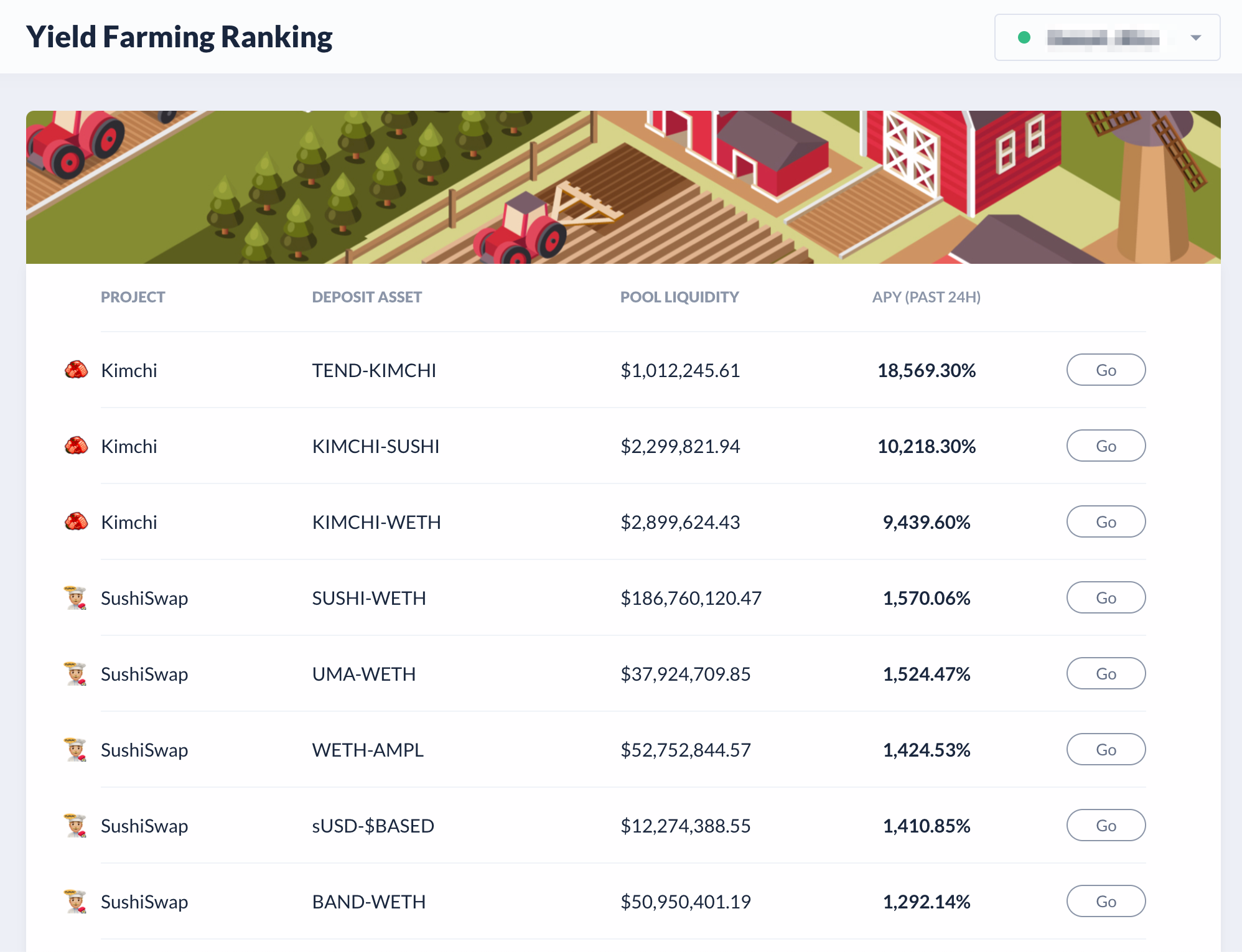 Yield Farming 서비스들의 APY가 높다고 무작정 들어가면 큰일 난다는거 아시죠? 이 사이트의 랭킹은 참고만 하시고 안전하고 믿을만한 곳을 찾아서 투자하시길 바랍니다. Yield farming 수익률은 초반에 높다가 지속적으로 떨어진다는 거 감안하시고요. :)