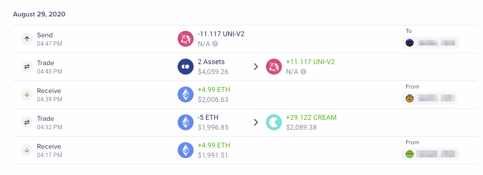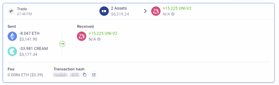 위 거래 내역은 유니스왑 CREAM/ETH 풀에 유동성을 제공한 기록이예요