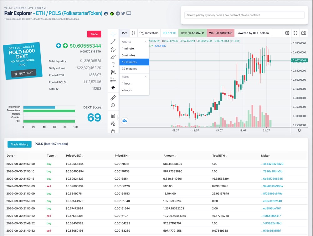 dextools 는 실시간 거래량과 차트를 동시에 볼 수 있어 좋습니다. 다만, dextools의 차트는 1분 이상 지연된 데이터라고 합니다. 회원 가입을 하고 5000 dext 를 지갑에 보유해야 딜레이 없는 차트를 볼 수 있다고 하네요.