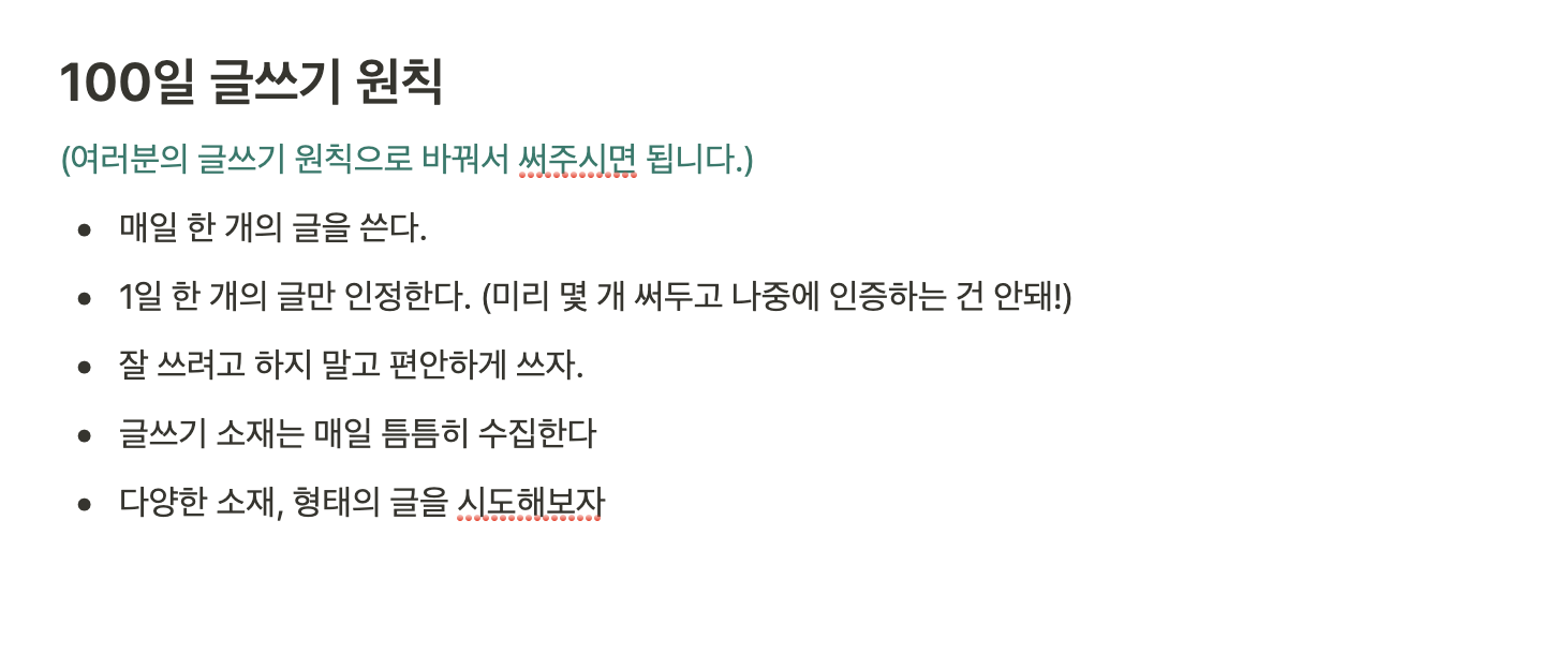 항상 보고 다시 리마인드 할 수 있도록 100일 글쓰기 원칙을 적는 공간을 넣었어요.
