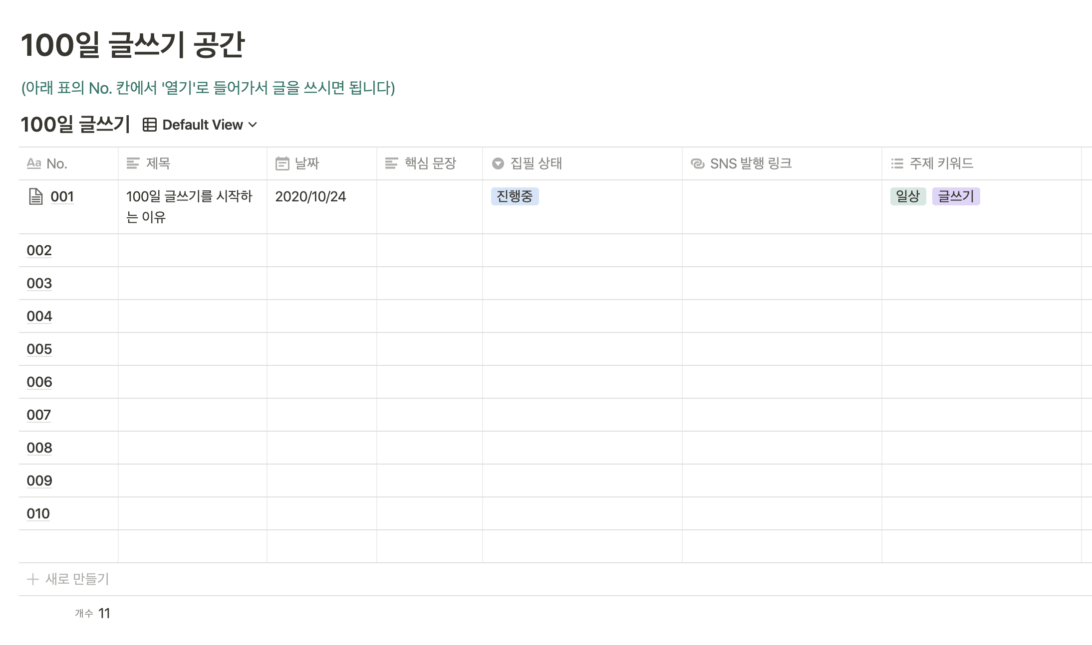 표에 001 ~ 100까지 하나씩 칸을 채우면서 100일 글쓰기를 할 수 있도록 만들었습니다.