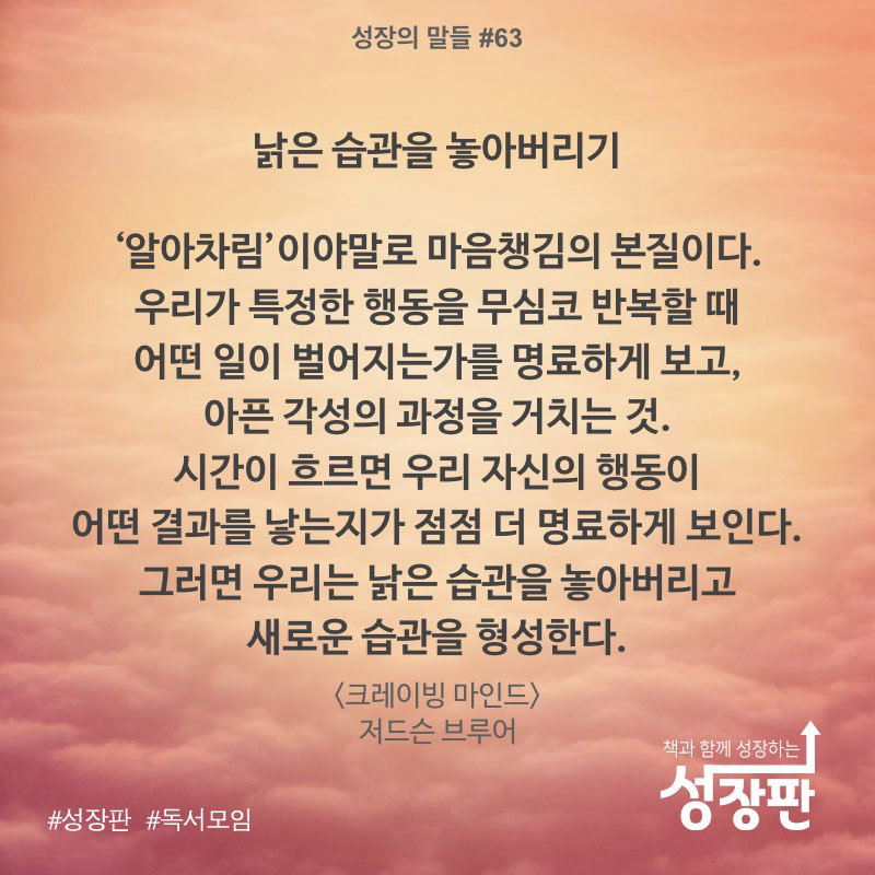 <크레이빙 마인드>에서는 낡은 습관이 만드는 결과를 명료하게 보고, 아픈 각성의 과정을 거쳐 진정으로 알아차릴 수 있을 때 비로소 낡은 습관을 버리고 새로운 습관을 형성할 수 있다고 말한다.