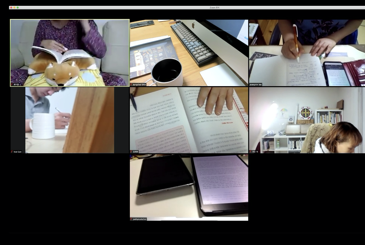 - 책 읽고 있는 모습을 카메라로 줌에 공유하면서 각자 책을 읽는다 : 책을 읽는 장소는 카페나 집, 어디든 상관 없음 : 얼굴이 꼭 공개되어야 하는 것은 아님, 책 부분만 나와도 OK : 마이크는 꺼서 주변 소음이 전달되지 않게 한다.