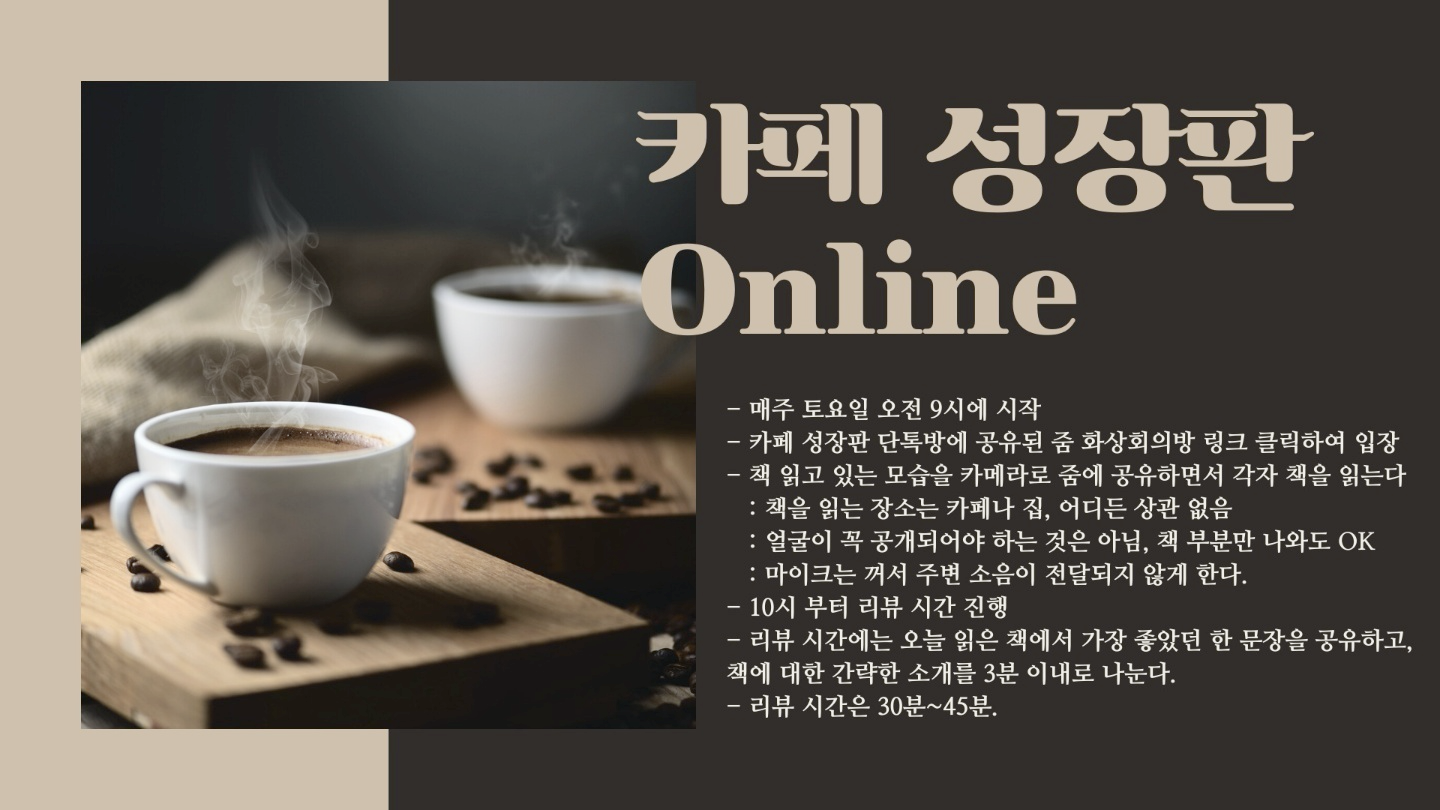 토요일 아침마다 '카페 성장판'이라는 온라인 모임을 하고 있어요. 9시에 시작해서 10시 반에 끝납니다. 줌(Zoom) 화상회의 방에 들어가 책 읽는 모습을 카메라로 공유하면서 1시간 동안 각자 책을 읽고, 뒤이은 리뷰시간에 돌아가며 읽은 책의 소감을 짧게 공유하는 거예요.