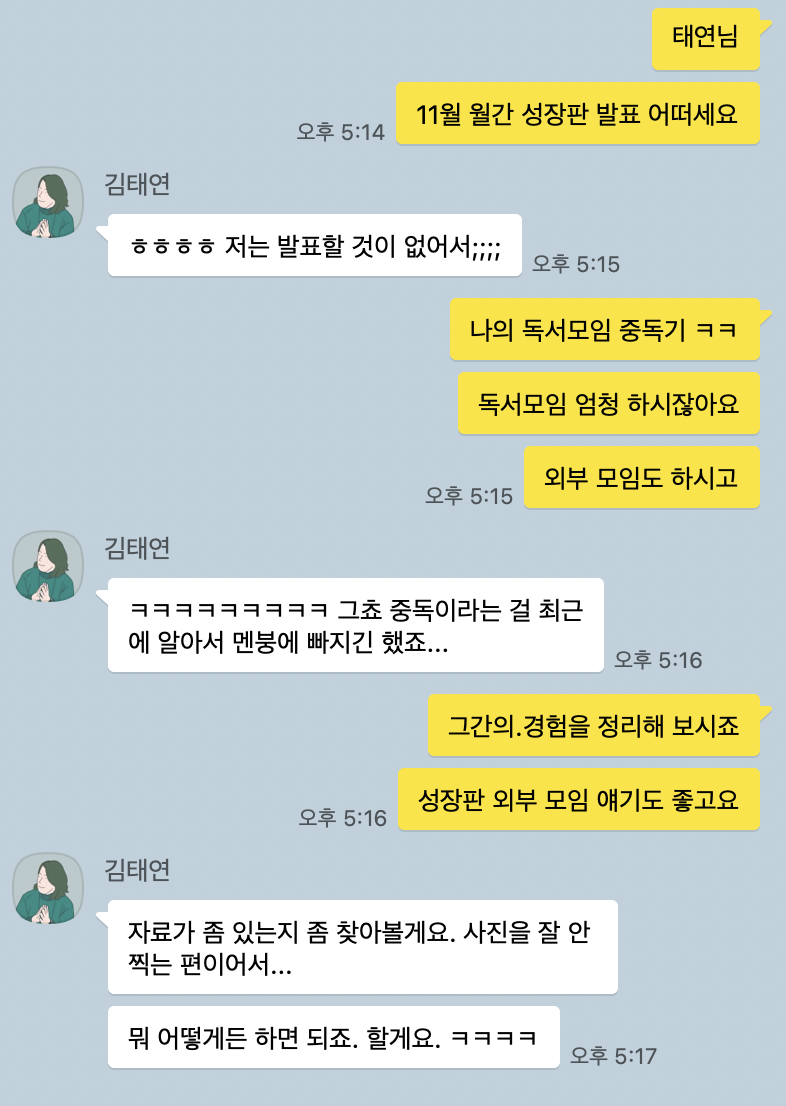 태연님의 경우도 그랬다. 11월 월간 성장판 발표를 하시면 어떻겠냐고 제안했을 때 '발표할 것이 없다'고 답을 했다. 내가 '독서모임 중독기'를 주제로 하면 좋겠다고 제안을 하니 그제서야 하겠다는 마음을 가지셨다.