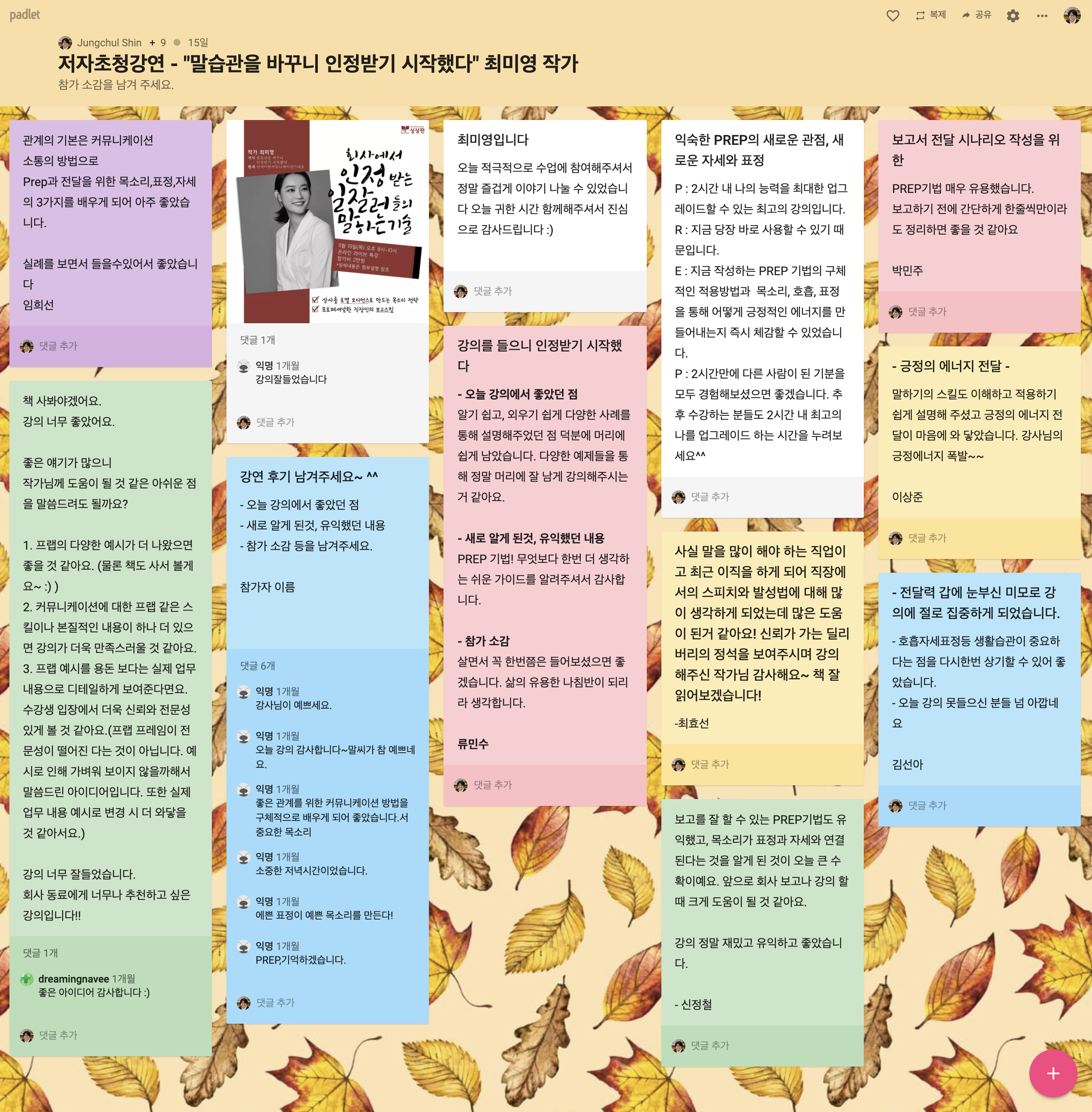 패들렛은 온라인 모임이나 강의 후에 참가 후기를 받을 때 아주 좋습니다. 패들렛의 링크만 Zoom 채팅창에 공유하면 참가자들이 링크를 클릭해서 패들렛에 접속해서 아래와 같이 포스트잇을 붙이는 것처럼 참가 후기를 남길 수 있습니다.