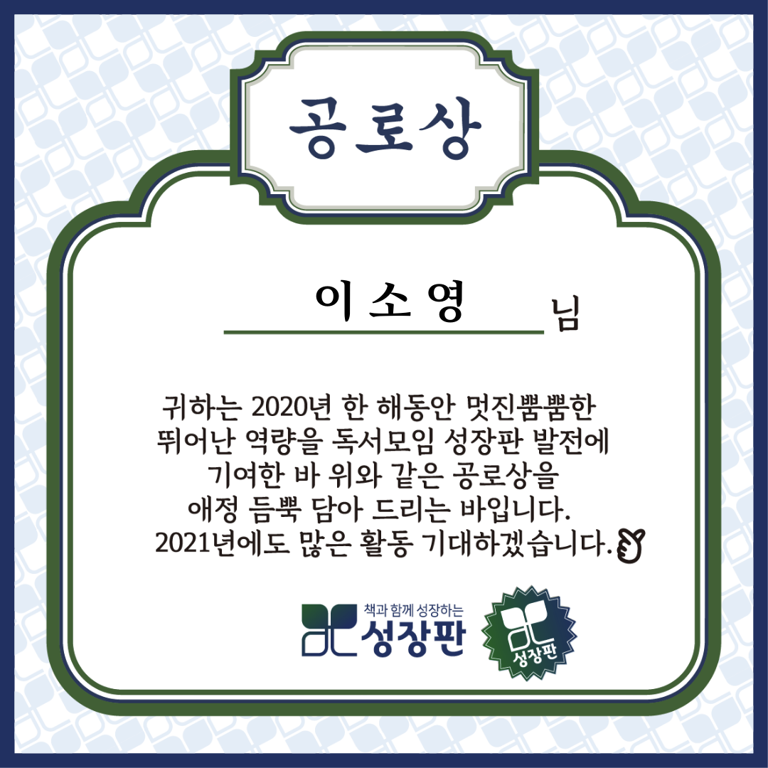 성장판 회원 여러분 각자가 뽑은 올해의 책을 소개해 주세요. (참석자 전원 발표)ex) 코로나로 우울한 분들에게 OOOO 책을 추천합니다.
