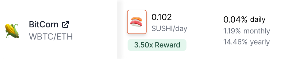 스시스왑 wBTC/ETH 페어 채굴 APY 대략 14.46%