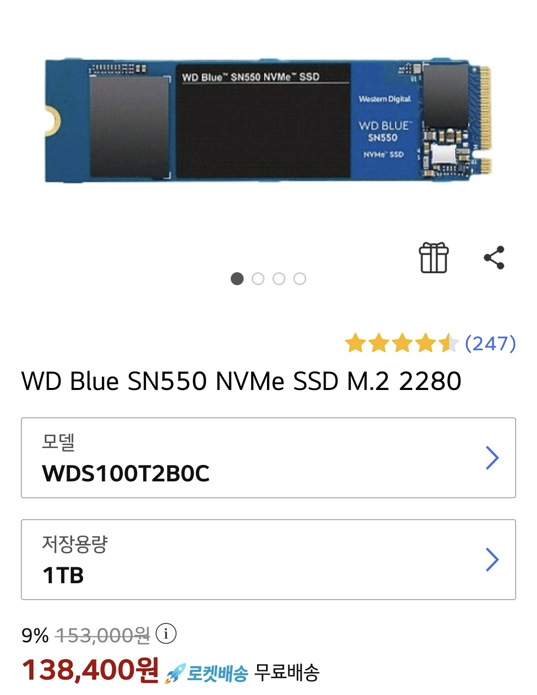 삼성 1TB SSD는 가격이 비싸서 성능은 약간 떨어지지만 가성비가 좋은 아래 제품으로 구입