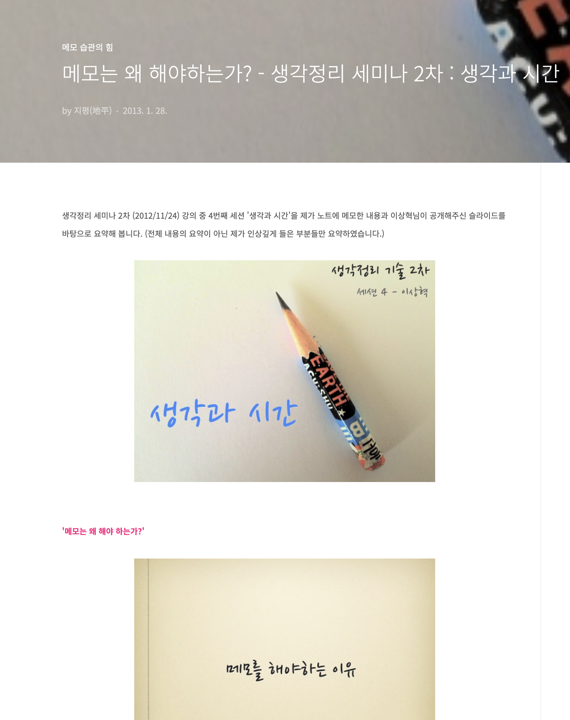 '메모는 왜 해야 하는가? - 생각정리 세미나 2차 생각과 시간' 라는 제목의 이 글이 제가 메모에 관해 블로그에 쓴 첫 번째 글이었어요.