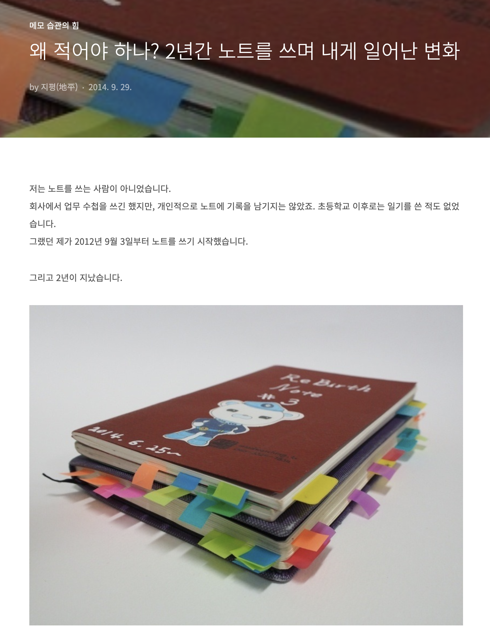 '메모는 왜 해야 하는가? - 생각정리 세미나 2차 생각과 시간' 라는 제목의 이 글이 제가 메모에 관해 블로그에 쓴 첫 번째 글이었어요.