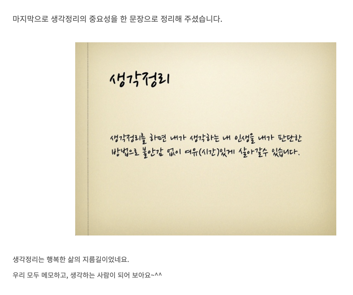 생각 정리 세미나를 다녀오고 후기를 씀녀서 저는 메모하는 사람이 되어야 겠다는 다짐을 했어요. 그 덕분에 2년 후에 제 삶에 변화가 일어난 거죠.