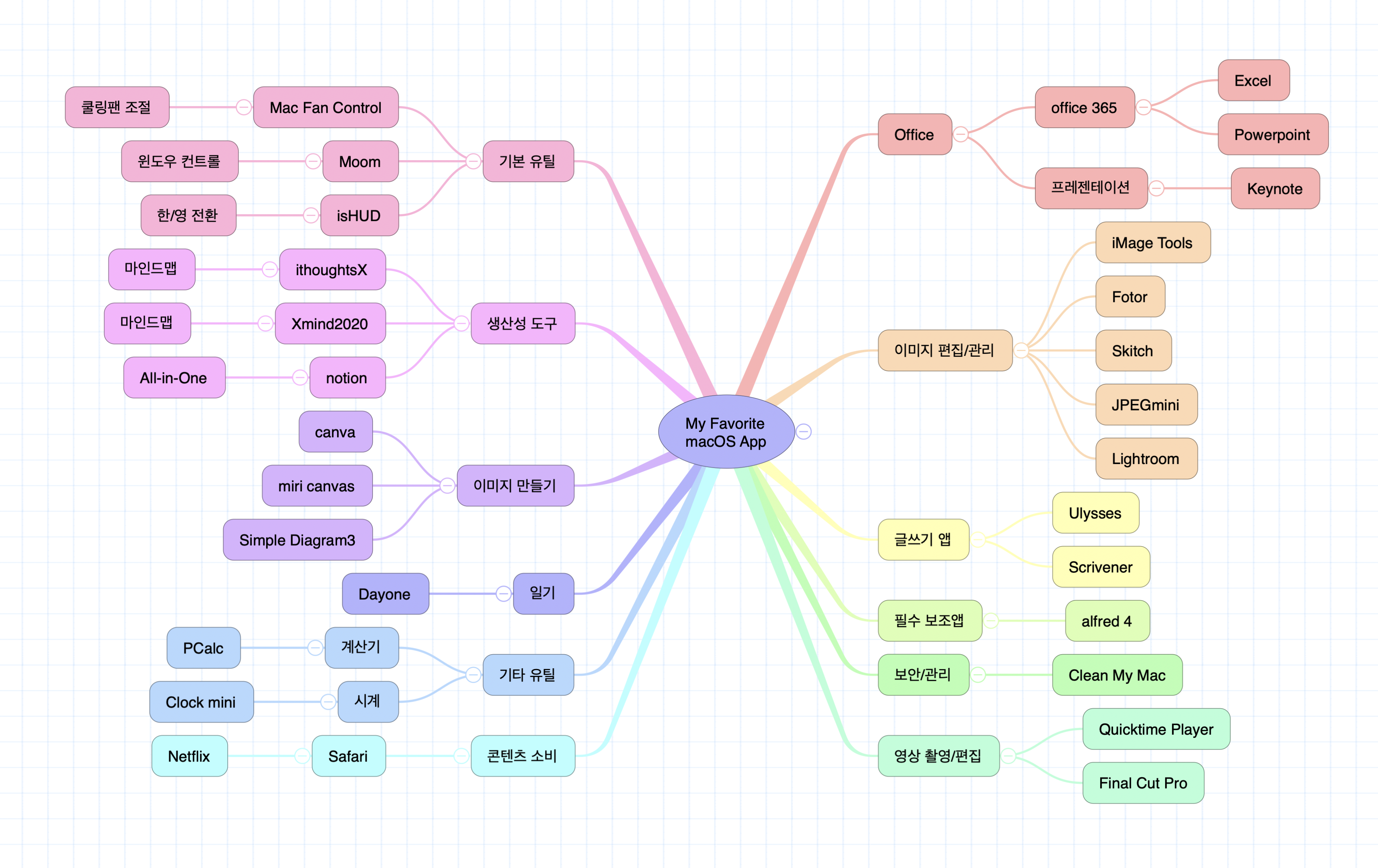 오늘은 그 강의도 준비할 겸 제가 즐겨 사용하는 macOS 앱을 마인드맵으로 정리해 봤어요.