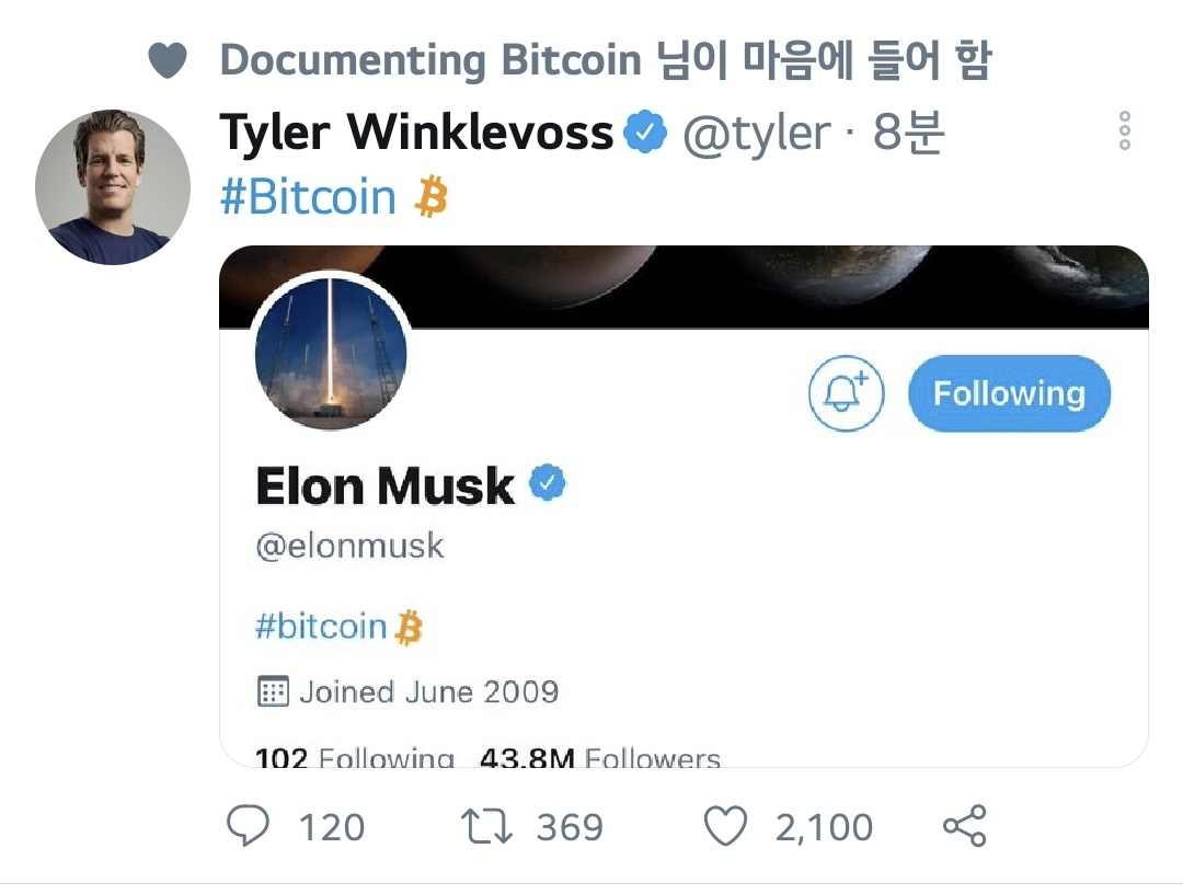 윙클보스 형제도 #bitcoin 해시태그를 달아서 머스크의 프로필을 리트윗하고