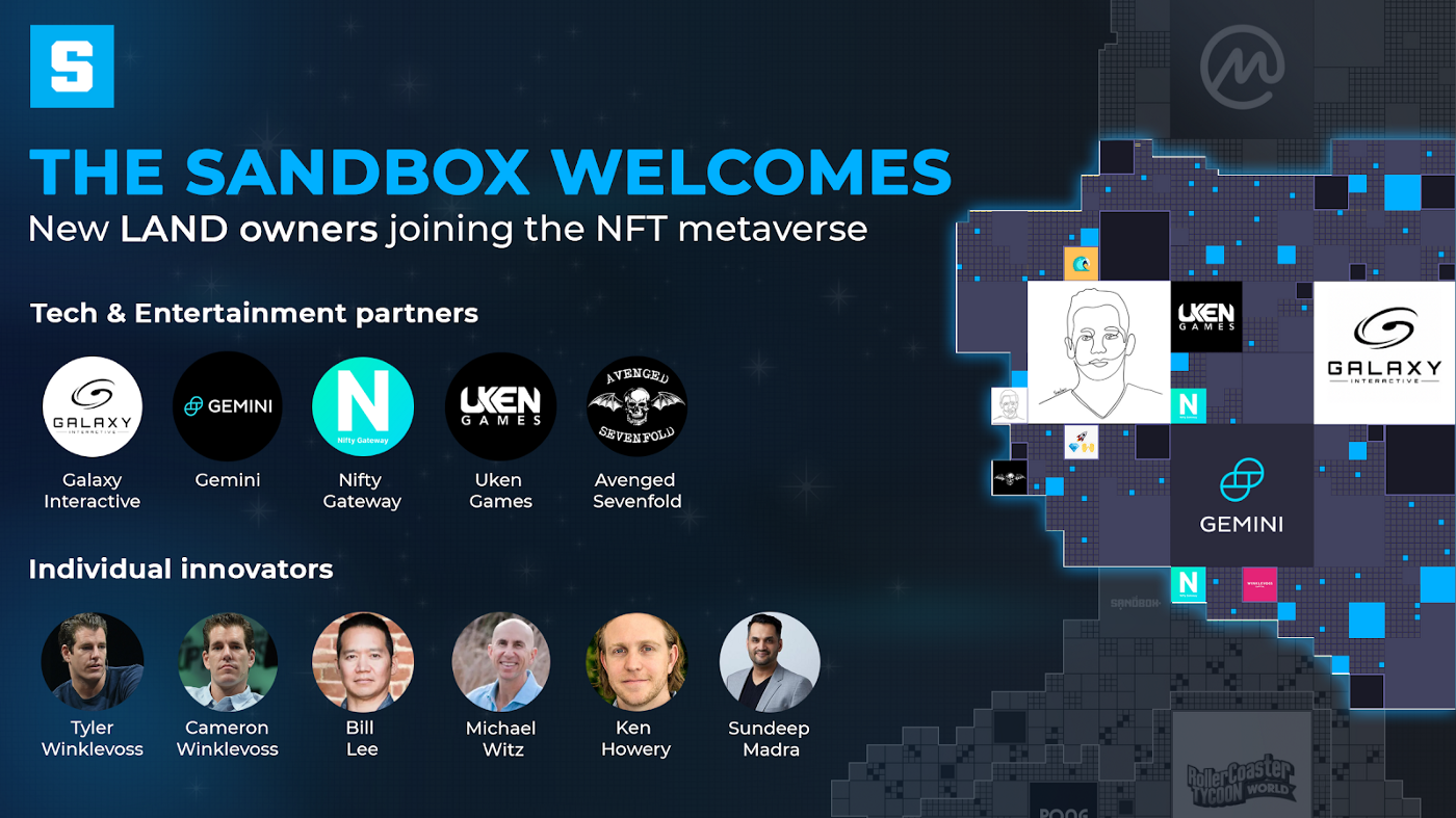 유켄 게임즈(Uken Games), 빌 리(Bill Lee), 켄 하워리(Ken Howery), 갤럭시 인터랙티브(Galaxy Interactive), 타일러 윙클보스(Tyler Winklevoss), 제미니 프론티어 펀드(Gemini Frontier Fund), 니프티 게이트웨이(Nifty Gateway), 어벤지드 세븐폴드(Avenged Sevenfold)가 더 샌드박스의 NFT 기반 메타버스에 들어오며 LAND를 확보하고 다양한 경험을 만들어가게 되었습니다.