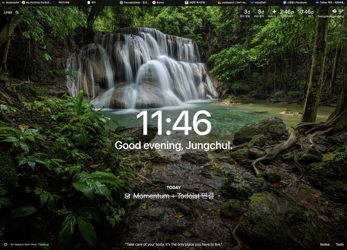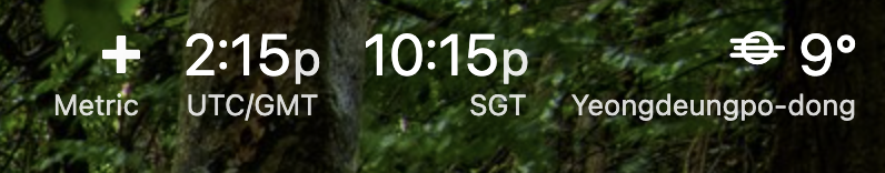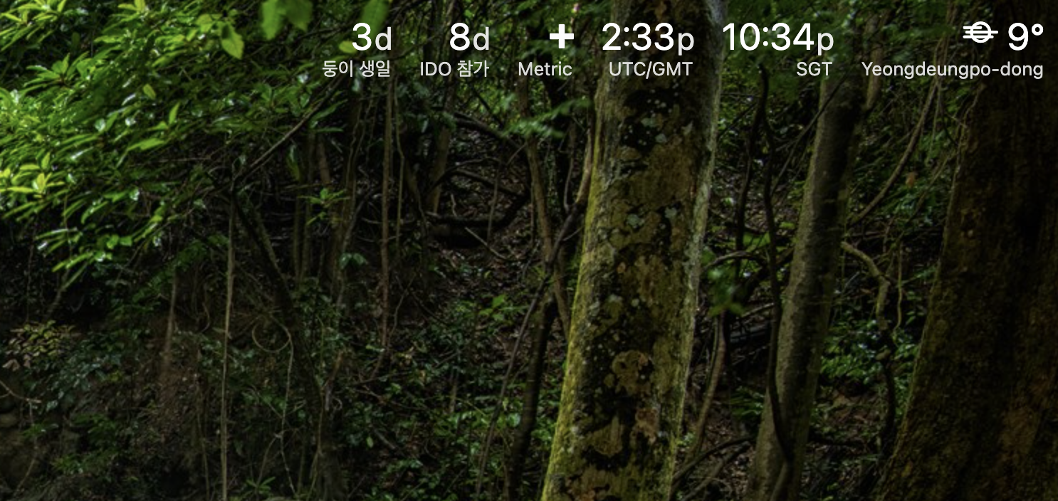 우측 상단에 세계 여러 지역의 시간을 표시해 놓을 수 있다. 코인 투자를 하다보면 IDO 등을 참여할 때 UST, PDT, SGT 등 다앙한 시간대로 쓰여진 공지 글을 읽고 우리 시각을 계산해야 하는데 Momentum의 clock 기능을 이용하면 자주 참조하는 세계 시간을 등록해 놓을 수 있어 편해질 것 같다.