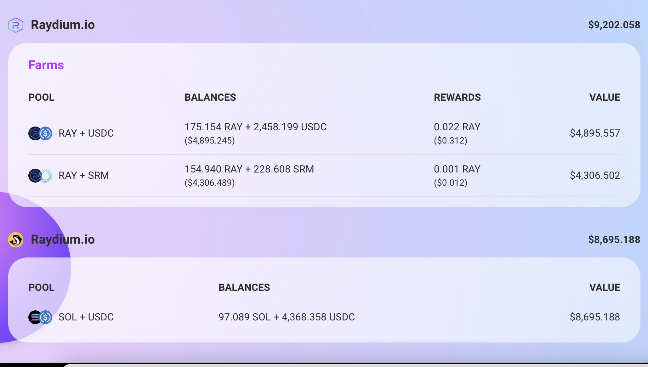 APE BOARD에 솔라나 지갑 주소를 등록하면 아래와 같이 Farm에 예치한 자산 현황을 보여줍니다.