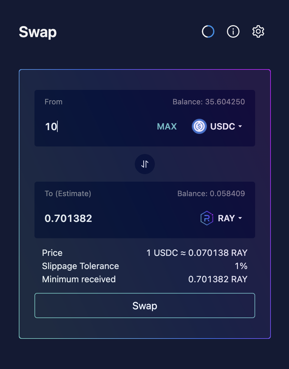 입금해둔 USDC를 RAY 코인으로 스왑합니다.