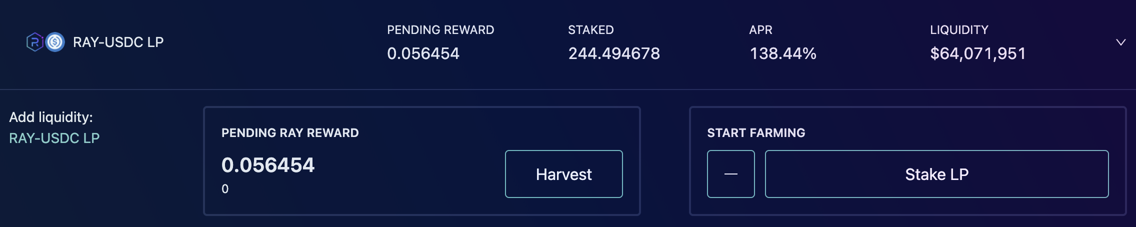 FARM 페이지로 가서 위에서 만든 RAY-USDC LP를 스테이킹합니다.