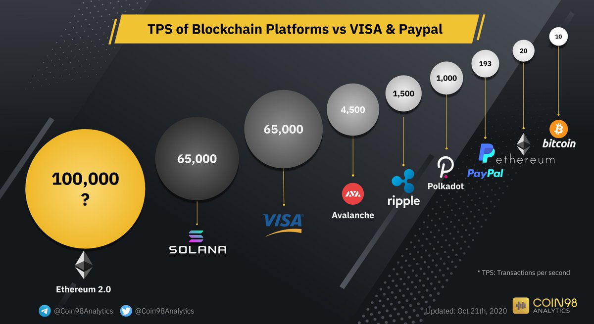 - 솔라나의 거래 처리량은 59,000 tps로 VISA 카드와 거의 비슷한 수준이다. (이더리움은 17~20 tps )