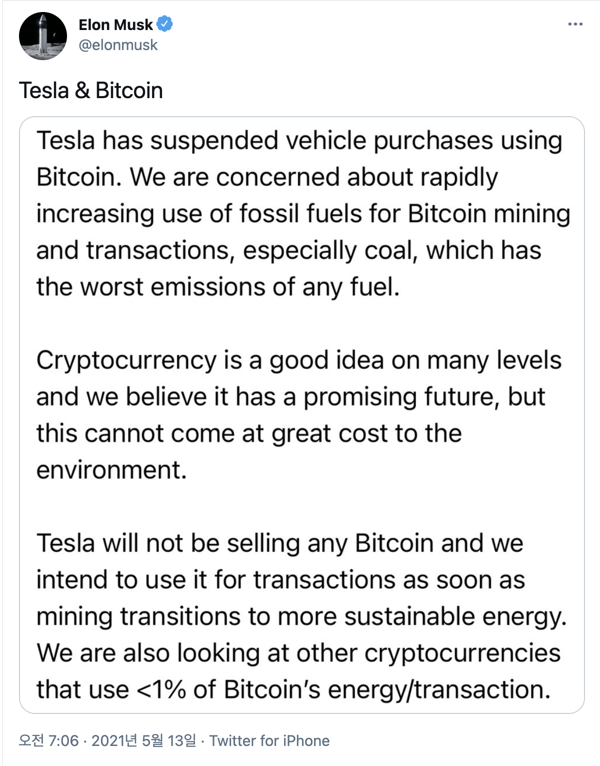 5/13 일론 머스크가 트윗을 올리고 비트코인은 급락을 했다. 비트코인 채굴을 하는데 들어가는 화석 연료의 급증이 우려스러워서 비트코인으로 테슬라 살 수 있게 한 것을 중지한다는 내용.