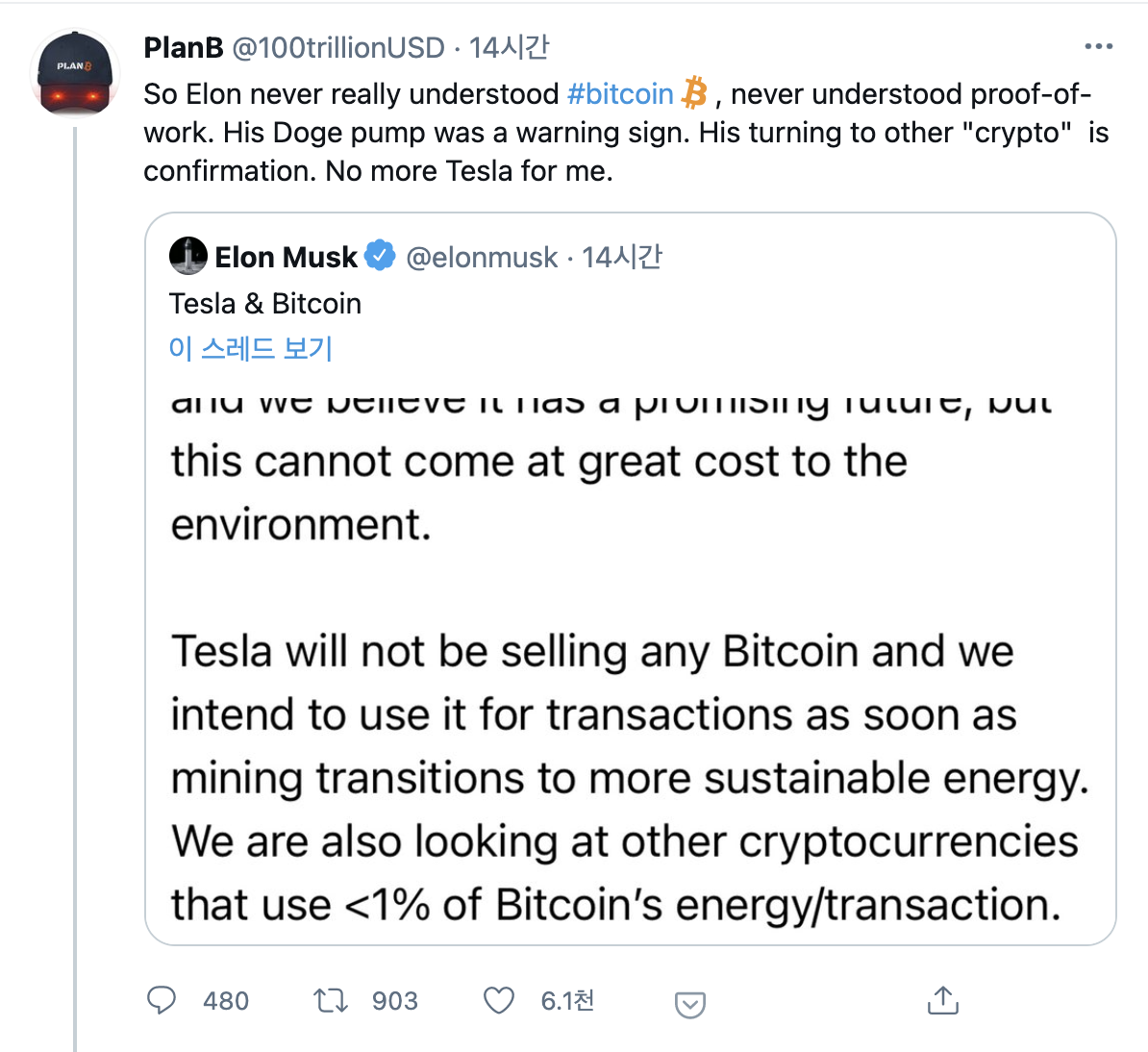 도지 코인으로 테슬라 결제 받고 싶은게 머스크의 속셈이었나? 이로서 머스크는 비트코인의 철학 따위에는 관심이 없다는 것이 드러났다. 탈중앙 시스템으로서 분산 신뢰를 통해 신뢰 혁명을 일으키는 비트코인의 가치를 전혀 이해하지 못하고 있다. 비트코인의 PoW는 비트코인이 탈중앙성을 갖기 위해 필수불가결한 것이다. 그리고 현재 비트코인 채굴의 70% 정도가 신재생 에너지를 활용하고 있다.