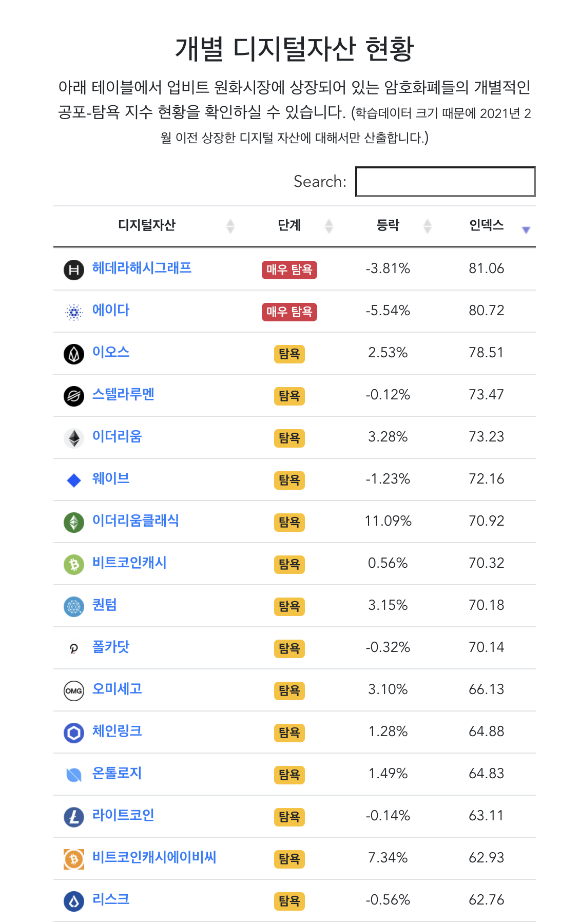그리고 무엇보다 유용한 것이 개별 코인 종목 별로도 공포-탐욕 지수를 볼 수 있다는 거예요.