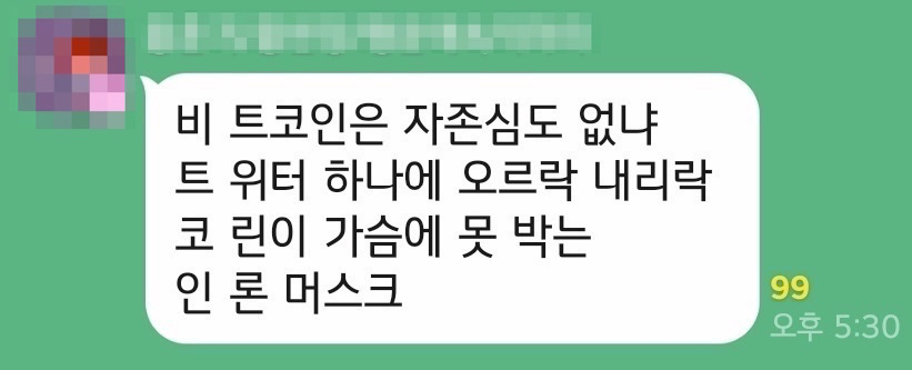 일론 머스크의 트잇 하나에 수모를 겪은 비트코인에 대한 안타까움과 머스크에 대한 분노를 잘 표출한 작품이네요.