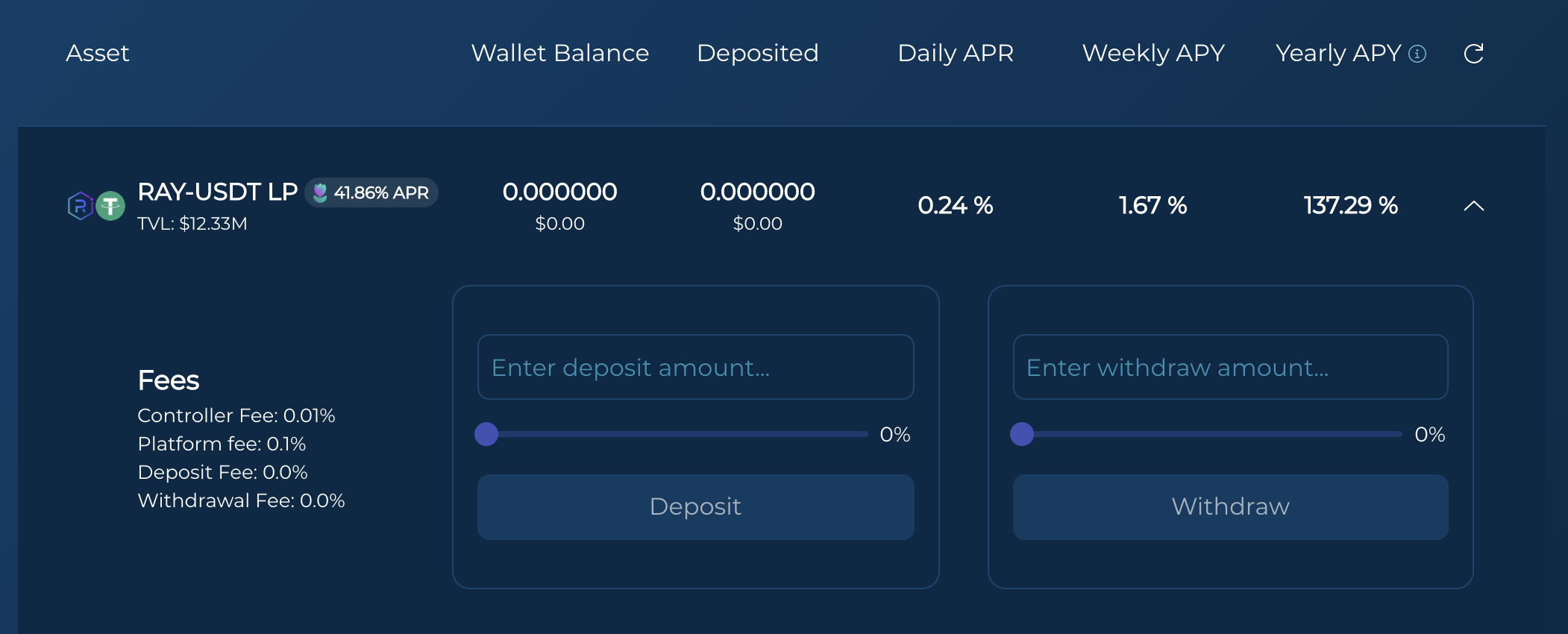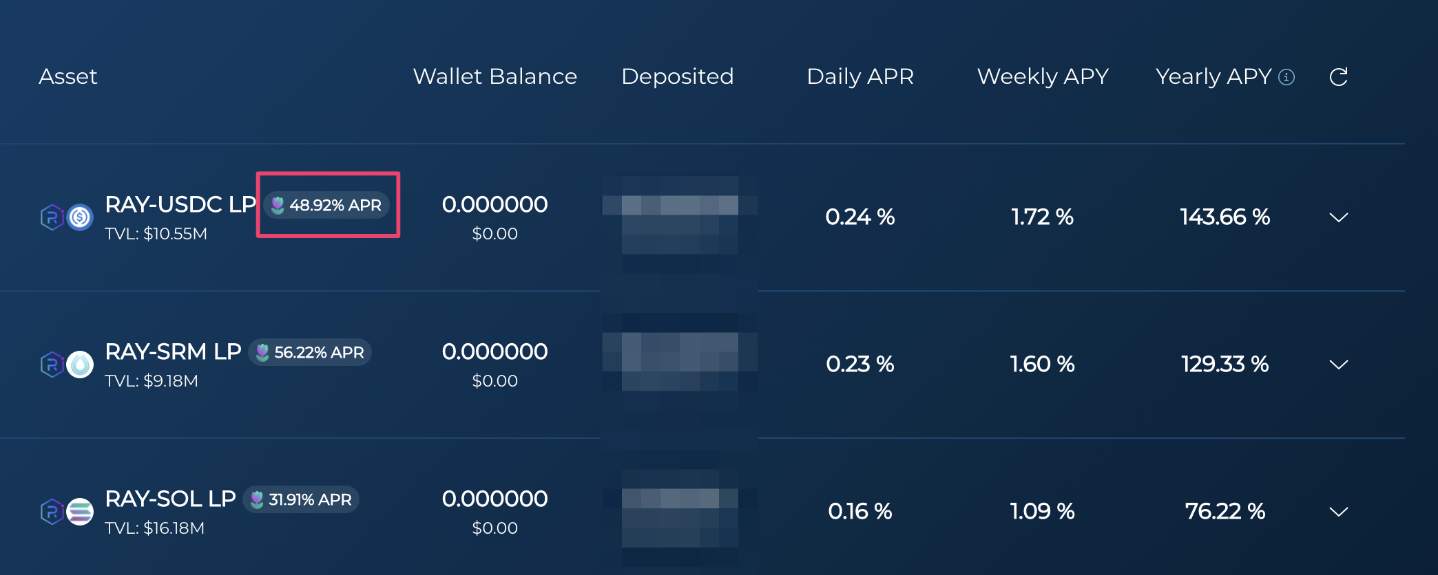 보통은 LP를 스테이킹(staking)한다고 표현하는데 솔팜에서는 deposit 을 쓰고 있습니다.