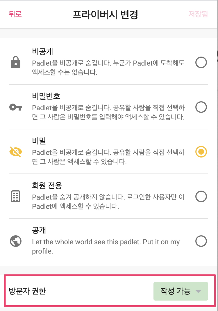 4) 패들렛 계정 주소에 방문하는 누구나 게시물을 볼 수 있게 하려면 프라이버시를 '비밀'에서 '공개'로 바꿉니다.