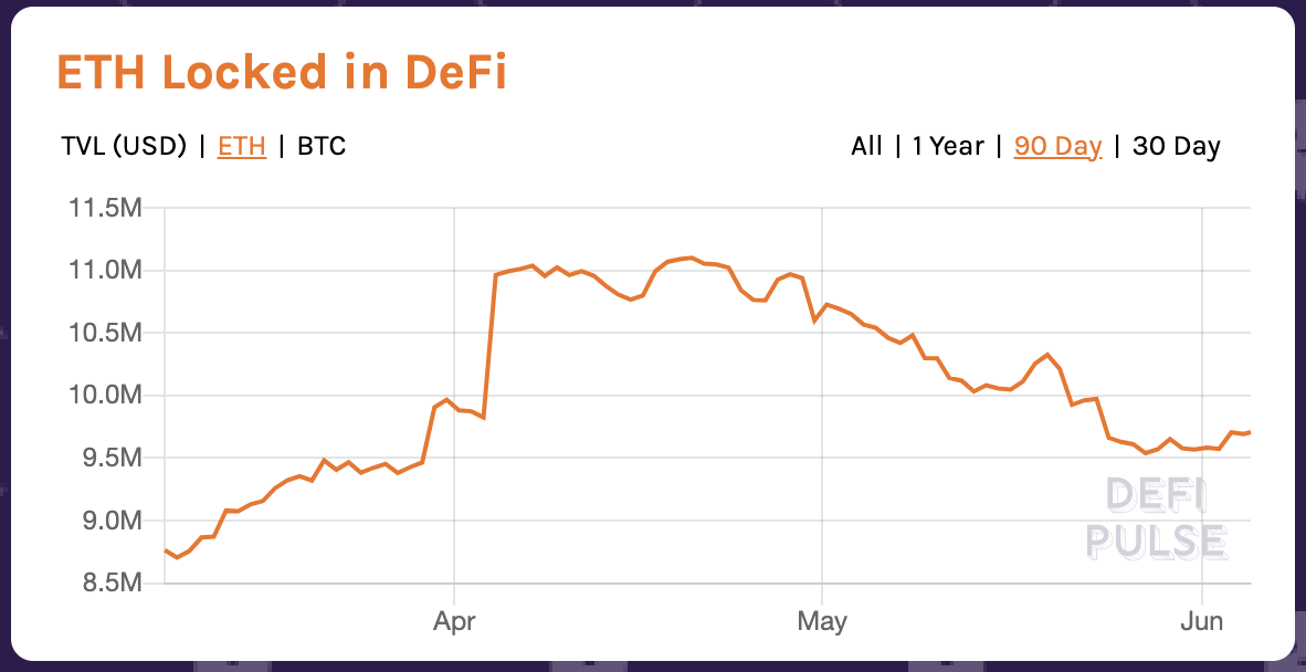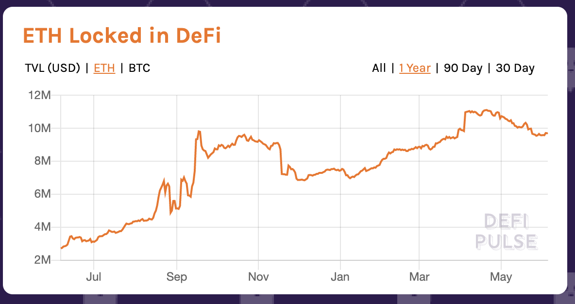 TVL을 USD가 아닌 ETH 개수로 보면 이더 가격에 구애받지 않는 Defi TVL을 볼 수 있다.