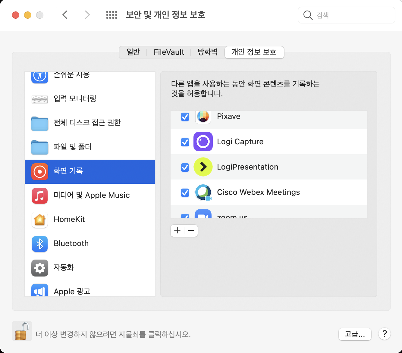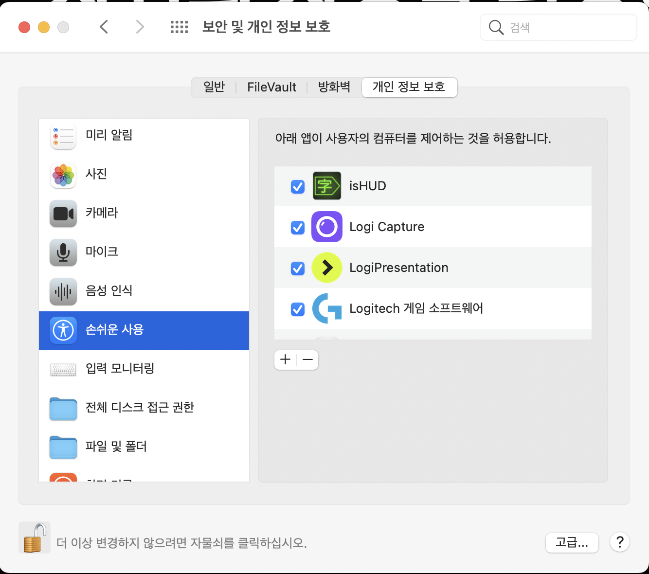 로지텍 스포트라이트를 사용하기 위해서는 아래와 같이 설정 - 개인정보 보호 탭으로 들어가서