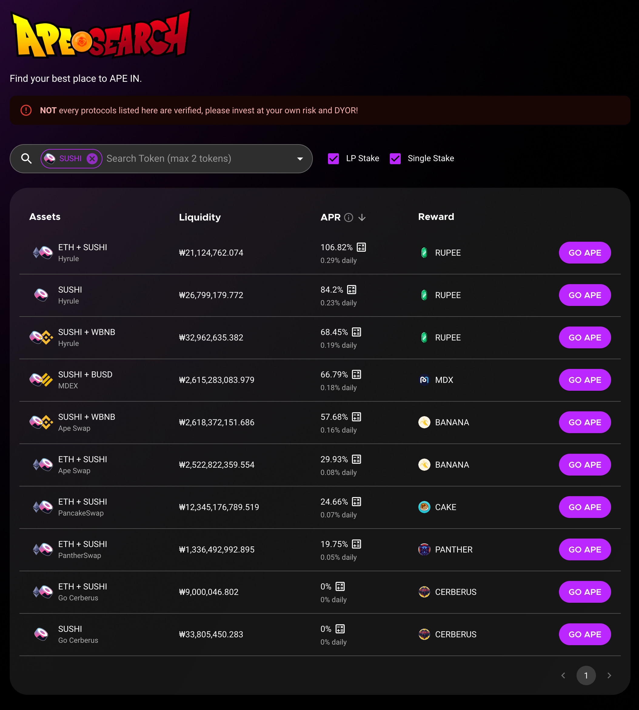 : 특정 코인을 예치할 수 있는 디파이 서비스를 검색할 수 있습니다. 내가 갖고 있는 코인을 어느 디파이 서비스에 넣을 수 있을까 찾을 때 유용한 서비스네요. (APE BOARD에 등록된 서비스들 내에서만 검색 가능합니다)