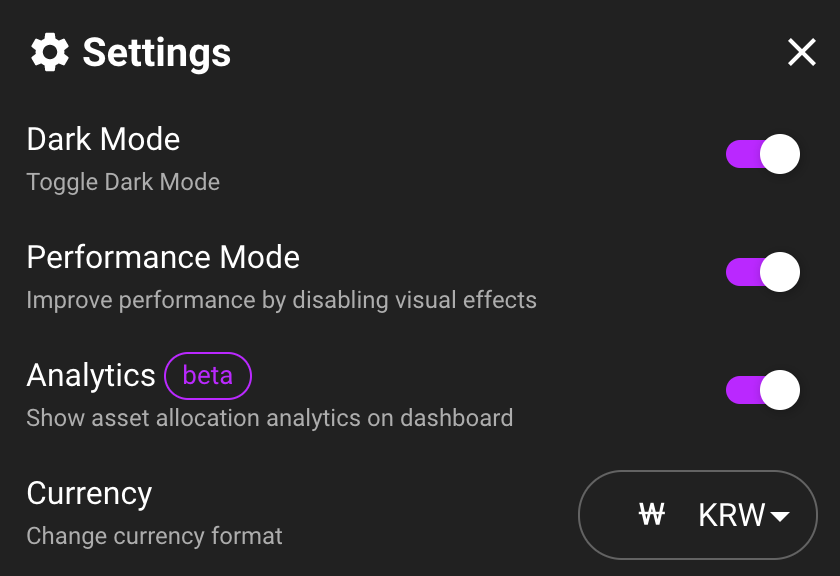 : 이건 새롭게 추가된 기능은 아니지만 안 쓰고 계신 분들이 있을 것 같아 소개합니다. 설정으로 가서 Currency를 KRW로 바꾸면 자산 가치를 원화로 보여줍니다.