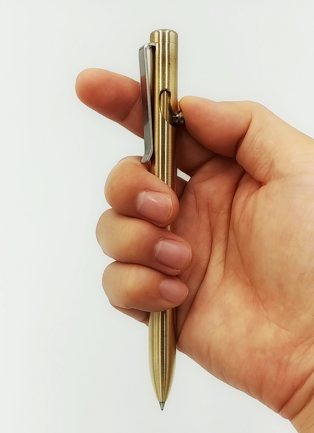 볼트 액션 펜의 가장 큰 특징은 펜촉을 내보내고 집어넣는 볼트 액션 메커니즘입니다. 상단 부에 돌출된 볼트를 엄지 손가락으로 딱 내리면 심이 나오고 딱 소리가 나면서 고정이 됩니다. 홈에 걸려있는 볼트를 엄지로 살짝 내리면서 옆으로 밀어주면 스프링에 의해 위로 끌려 올라가면서 심이 들어갑니다.