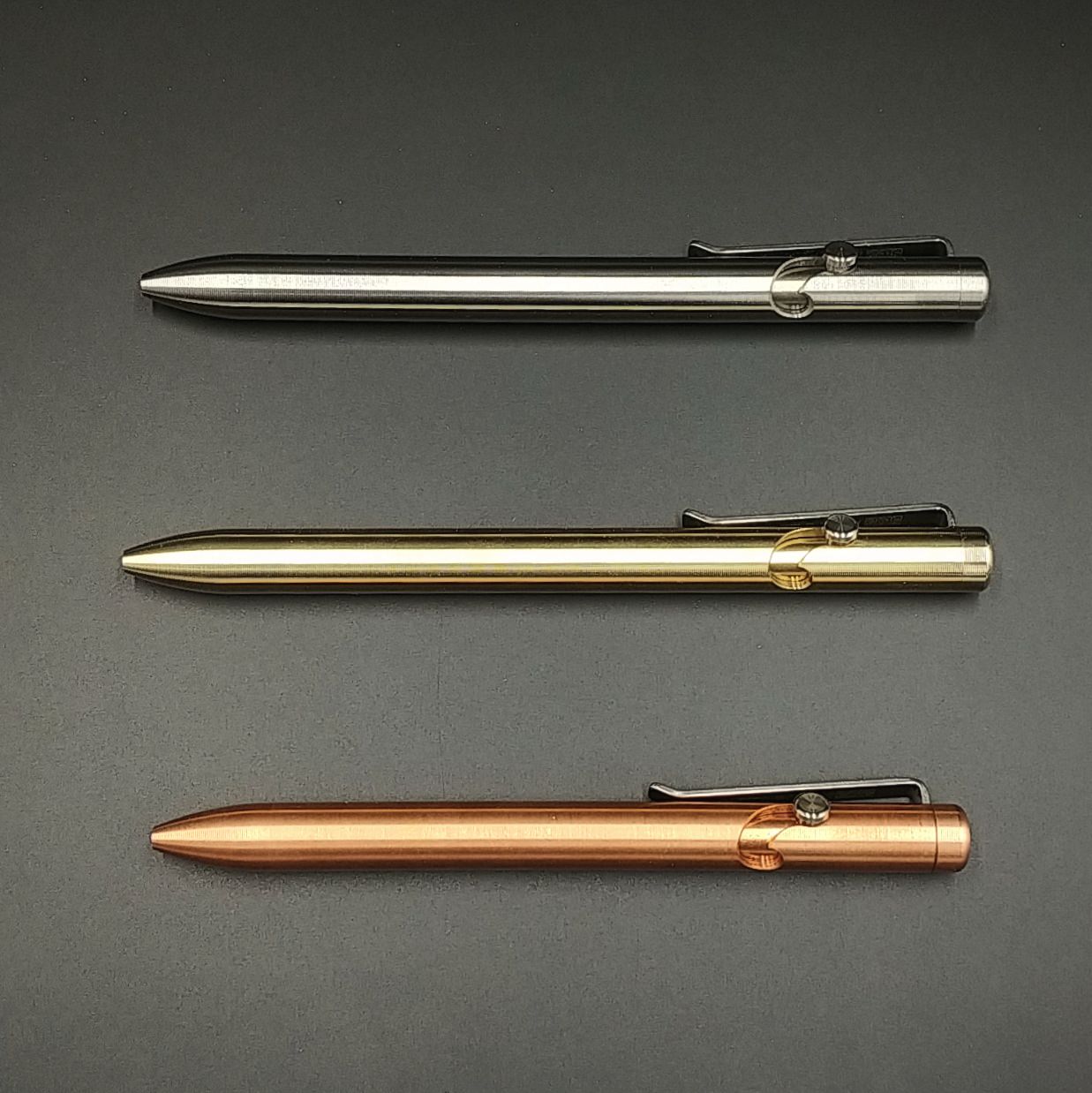 The main piece that makes these pens interesting is the unique bolt action. It’s one fluid motion to advance or retract and, because the surfaces of both the interior part and the inside surface have been carefully machined to be extra smooth, the action f